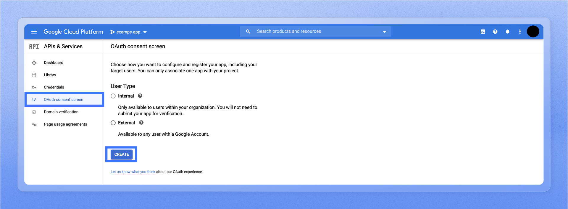 2. Navigate to the OAuth consent screen under APIs & Services. Choose how you want to configure and register the Plane app, including your target users, and click Create.